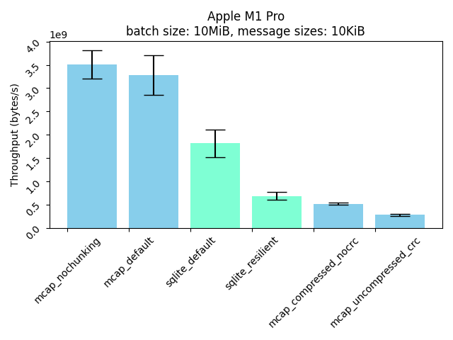 sqlite_default: The default configuration of the SQLite storage plugin, effectively measuring the performance that ROS 2 users get out-of-the-box. This is equivalent to running the following statements when opening a SQLite file:PRAGMA journal_mode=MEMORY; PRAGMA synchronous=OFF;. These settings produce the highest write performance available from SQLite at the risk of corruption in the case of an interruption or power loss.sqlite_resilient: The "resilient" preset profile of the SQLite storage plugin. This setting is equivalent to running the following statements when opening a SQLite file:PRAGMA journal_mode=WAL; PRAGMA synchronous=NORMAL. This removes the risk of an entire.db3file being corrupted, at the cost of performance. By using a write-ahead log, only the messages in the last few transactions may be lost if the data from those transactions were not fully committed to disk. Therefore in this mode, SQLite3 offers similar guarantees against corruption as MCAP.mcap_default: The default recording configuration of the MCAP storage plugin. Produces un-compressed, chunked MCAPs with a message index for efficient read performance. Chunk size is 768KiB, though chunks expand to fit if a message is larger than the chunk size.mcap_nochunking: The highest-throughput configuration of the MCAP storage plugin. Does not write a message index to the MCAP, so bags recorded with this mode need to be reindexed later to be read efficiently.mcap_uncompressed_crc: Likemcap_default, but calculates CRCs for each chunk so that readers can identify if a chunk contains corrupted data. This feature does not have an equivalent in the SQLite3 storage plugin.mcap_compressed_nocrc: Likemcap_default, but compressed each chunk withzstdcompression on default settings.